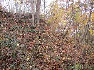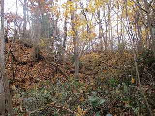 ヤブを突っ切って南側に進んで行くと、土塁が構築されていた。土塁の外側には城域を区画するこの城唯一の堀切が掘られている。ただし、深さは3mほどと、それほど規模の大きなものではない。