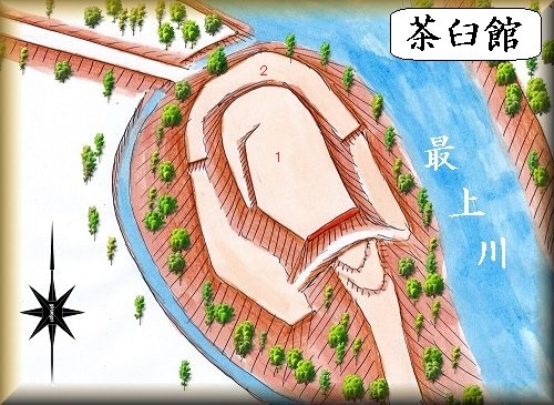 最上川に臨む比高20mほどの旧領先端部が茶臼館の跡である。腰曲輪からそびえて見える1郭の城塁の形状が、離れてみると茶臼型に見えたことから付けられた名称なのであろう。