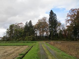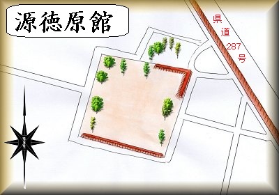 県道287号線のバイパスのすぐ南側にある民家の背後が館跡である。水田地帯の中で、ここだけ森になっているので、どこが城館跡なのかはすぐに分かる。