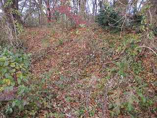 南側の土塁は、かなり低くなってしまっているものの、現在でも確認することができた。手前が少し窪んでいて堀跡であると思われる。土塁を崩して堀を埋めてしまった名残なのであろう。
