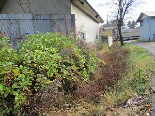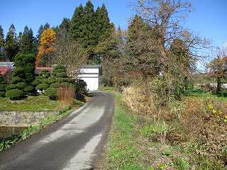 | 南側の堀。蔵が櫓のように見える。 | 南側の虎口。枡形の土塁は現在では取り払われてしまっているようだ。 |