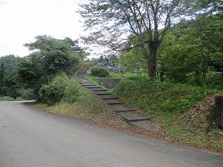 城にアクセスするには南側の山稜先端部から取り付いて行くのが簡単である。南端の低い部分には墓地が造成されている。その入口はこの場所である。その辺りの道路は路肩が広くなっており、墓参りの人はそこに車を停めているようだ。私も、そこに停めさせていただいた。