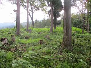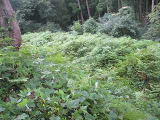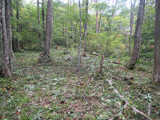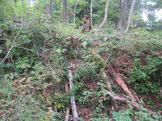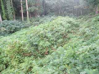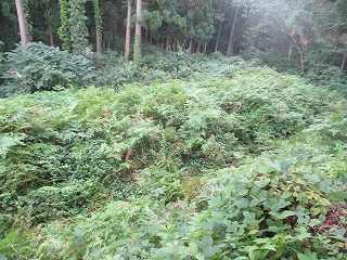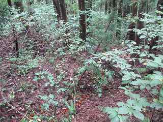 | この辺りから尾根状地形となり、竪堀は横堀となって行く。 | 平場が見えてきた。なぜかここだけが草刈りされていた。 |