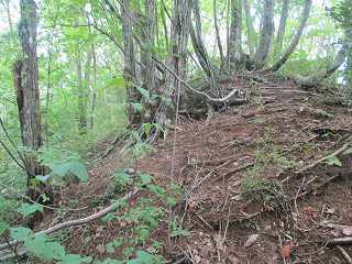 その辺りで、西側の下からくる道と合流した。この道はその先の平坦部に建てられている鉄塔のメンテナンス用の通路である。この通路に従って進んで行くと、堀切と土塁が見えてきた。通常の山城で見られるような土塁と堀切で、深さはそれほどでもないものの、壁面は鋭く削られている。その間の虎口にかけて土橋が接続している。