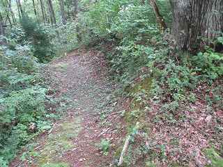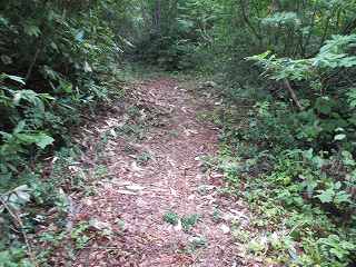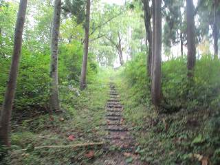 | 林道を走って行くと案内板が設置されているのが見えてくる。 | 登城道。比高20mほどなのですぐ登れる。 |