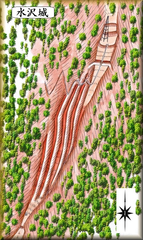 このように水沢城には、尾根上にいくつかの郭が造成されてはいるが、メインとなっているのは郭部分ではなく、尾根から南端部にかけて長く延びている連続竪堀である。郭の規模に比して竪堀の規模が異常に大きい。これは何を意味しているのか。
