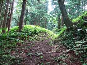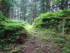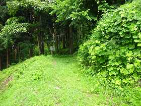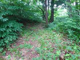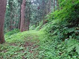 登城道の傾斜はそれほど急ではないため、真夏とはいえ、たいして苦労せずに登ることができる。ただし雨上がりであったため道は濡れていた。ヤブというほどではなかったのだが、道に生えている草は水分を含んでおり、この登城道を歩いているうちに、すっかり靴の中がグショグショになってしまった。
