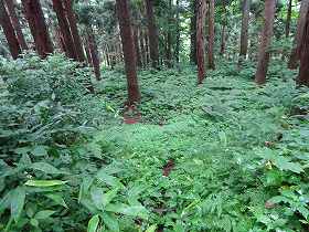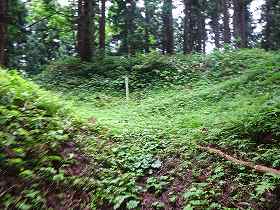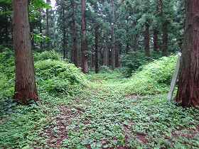 最初の枡形に戻ると、跡は地形なりに北側に向かって何段もの郭が連続している。ただし、夏場で草刈りがされていないうえに、雨上がりで草が濡れていたため、先まで進んでいくことができなかった。乾いていれば通れなくもなかったのだが、雨上がりでヤブが濡れている状態ではとても進入できない。この先の遺構は次回の課題としたい。