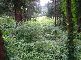 ってなわけで、東側部分に進んでいこうと思ったのだが、道は途中で途切れ、ヤブだらけになっていた。こちら側の土橋に通じる通路は、現在では全く使用されていないらしい。ヤブを潜り抜けていけば、その先の土橋まで行けるのだと思うが、雨が降り出してきたので、それはやめておいた。