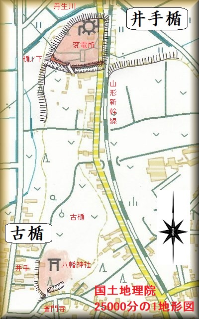井手楯は、JR大石田駅の北西600mほどのところにある。丹生側に臨む比高8mほどの台地の先端部という地形である。三角形に近い形状で、東西90mほどの規模である。