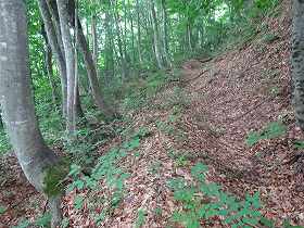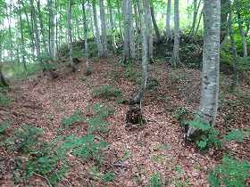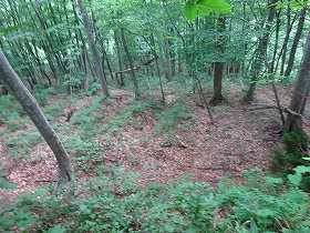 今度は南側の斜面に回り込んでいくと、そこは二段の横堀となっている。ただし、それほど大規模なものではなく、どちらかといえば塹壕のようなものである。