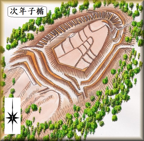 次年子楯は、次年子簡易郵便局の西方にそびえる、比高50mほどの山稜先端部に築かれていた。城の東側斜面から上がっていく道路があり、この道路からなら20mほど上がれば城内に到達できる。道はないがこの辺りから登ればすぐである。