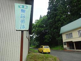 駒籠楯は、最上川に臨む比高10mほどの台地先端部に築かれていた。県道123号線を東側から進んでくると、台地を上がったところの建物脇に「駒籠楯」と書かれた案内板が立てられている。この場所である。ここが2郭の入口であり、すぐ脇には土塁がそびえているのが見えている。