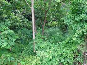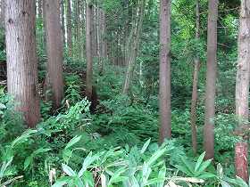 | 北西側山麓から見上げる次年子楯。ここからの比高は50mほどある。 | ちゃんとした道はないが、南側側面部のこの辺りから登れば、すぐに背後の三重堀切のところに出る。 |