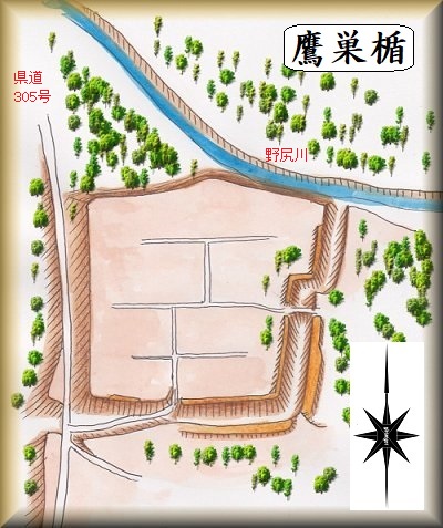 鷹巣館は、野尻川に臨む比高10mほどの台地先端部に築かれていた。西側から県道305号線を南下していくと、道路は城の側面部を通って、南端部に達する。そこで城内j方向に進んでいく道があるので、これを進んでいくと城内に入ることができる。