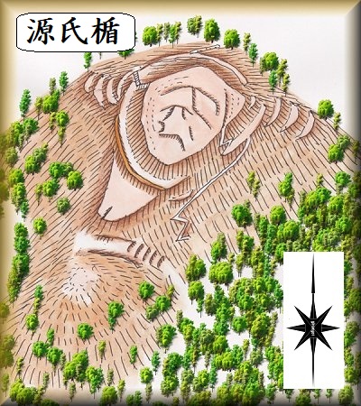 | 東方から遠望する源氏楯。山麓からの比高は90mほど。木が切られている。 | 源氏楯の案内板。 |
