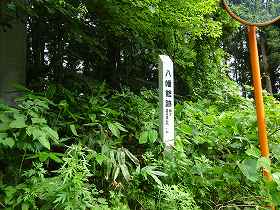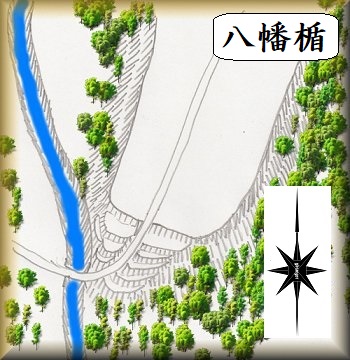 といったことで、実際に訪れてみても遺構らしきものを見ることはまったくできない。しかし、南端部分から下に降りていく道の脇に「八幡館跡」と書かれた標柱が立てられている。先端下には削平されたテラス状の小郭が何段か造成されているのがわずかに残る遺構と言えそうだが、こちらもヤブで分かりにくくなっている。