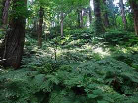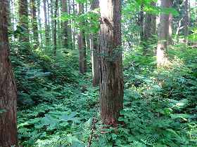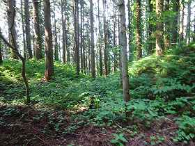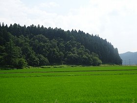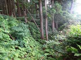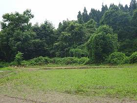 | 玄蕃楯の入口。しかし氷柱は「小十郎楯」となっている。実際にはここは玄蕃楯であったと思われる。 | 玄蕃楯の2郭。「作物栽培中」とあったので進入はやめておいた。奥に見える山林が1郭である。 |
