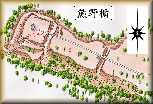 このように熊野楯は、西側に長く突き出した尾根を削平し、2区画の堀切を入れることによって2つの郭を確保した連郭式の城郭であった。