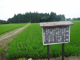 | 庭月楯の案内板。水田中の向こう側が館跡である。 | 堀の手前にかかる城址標柱。 |