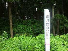 庭月楯は、八幡楯と南側に向かい合うような位置にある。鮭川に臨む比高20mほどの台地先端部近くである。北側の道路脇に案内板が立てられ、水田の先の先に見える山林が楯跡である。歩いていくと城址標柱が立てられ、その先に深い堀切が見えている。単郭で小規模であるが、堀の規模は大きい。