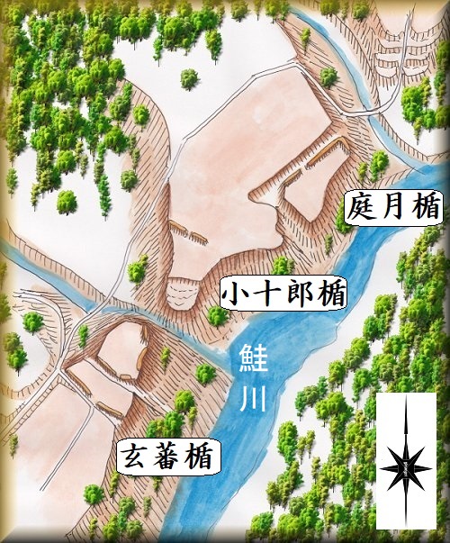 これら3つの楯跡は、八幡楯のすぐ南側、南北に近い距離で並んでいる。いずれも小規模な城館である。