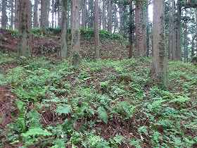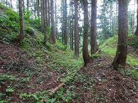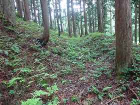 馬出しの西側下にも堀切が掘られており、後は傾斜した地形となっている。この馬出しから南側に降った斜面にも小規模ながら2段の横堀が見られる。いずれにしても、馬出しと言い、複数段の横堀と言い、なかなか技巧的な構造物である。しかも、ほとんどヤブがないために、これらの構造物を見通し良く眺めることができる。これは実に気持ち位のいいことでありながら、多くの山城ではできないことなのである。
