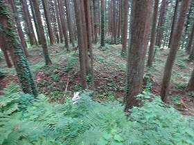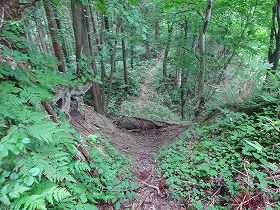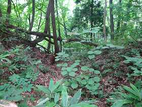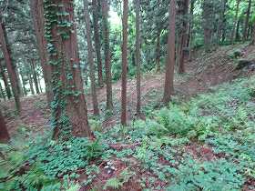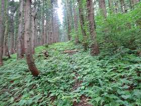 3つ目が、神社の脇の所から、斜面を直線的に登っていく道。手持ちの図面ではこれが正規の登城道のように描かれていたので、これにしたがって登っていったのだが、実際にはこれは道でもなんでもなく、ただの踏み跡に過ぎなかった。早朝で地面がまだ濡れていたため、足元がすっかり濡れてしまった。この道はお勧めではない。