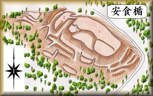 安食楯は、小さいながらも充実した遺構が見られる城郭である。東側に回り込んでいく道を進んでいくと、城の東下に達する。この辺りからが登りやすいので、車はその辺に停めさせていただく。