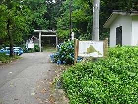 | 北側から遠望する鳥越楯。山麓からの比高は50mほど。 | 神社の入口。この脇辺りから登っていく。 |