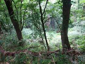 3段の横堀を越えて1郭の城塁に取り付いていく。比高20mほどなので、あっという間に1郭内部に入っていくことができた。1郭は80m×40mほどの規模がある。削平されているが、南側がやや低かったようで、2段構造になっている。また、進んでいくと中央の南側半分が、かなり窪んだ地形になるのが見えている。大型の枡形というわけでもなかろうから、もともとこの場所はかなり窪んだ地形になっていたものだろう。それを天然の大型枡形として活用することは可能である。