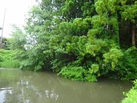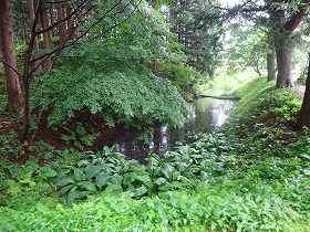 | 1郭にある神社。背後には高土塁がある。 | 虎口から見た水堀。 |