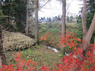 | 水堀跡C。土塁も見られる。 | 伊達家墓。 |