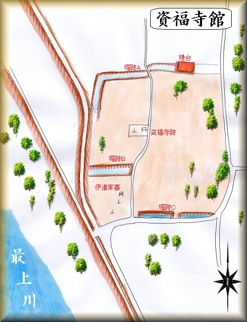 最上川の東側河岸段丘上に築かれた城館であった。資福寺跡はgooglemapにも掲載されているので、これを目印にしていけばよいと思う。