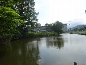 実際に訪れてみると、小学校の手前には、かなり大きな水堀がある。これがわずかに残る水堀の跡であるらしい。図面と比べてみると、水堀が残っているのはほんの一部だけで、ほとんど埋め立てられてしまっているのが分かる。