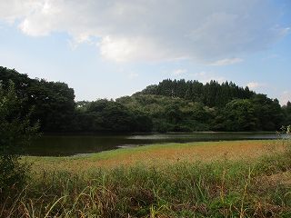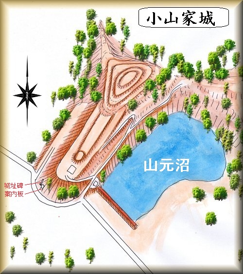 | 山元池越しに見る小山家城。 | 南西端に建てられている案内板。 |