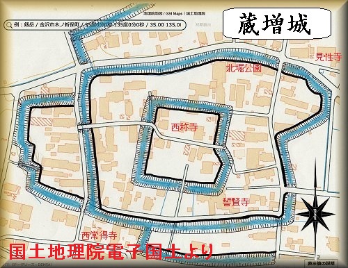 堀のラインが確認できるのは、その北側にある、その名も北堀公園の辺りである。公園の南側を流れている水路がかつての水堀のラインを示しており、公園の部分がそのまま堀の幅を示しているようである。