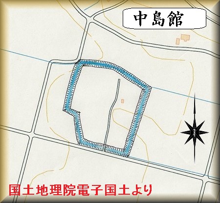 水田地帯の中に、畑となっている微高地が見えている。これが中島館の跡である。