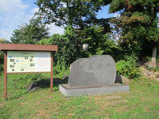 神社の西側に空き地があり、ここに城の案内板と城址碑が建てられている。この箇所には車も停められるので、安心して駐車することもできる親切な城址となっている。