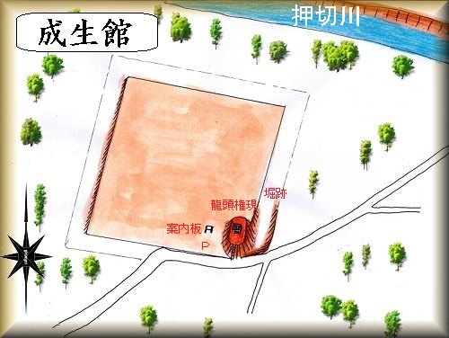 | 成生館は、天授元年(1375)より前に里見頼直によって築かれたと伝えられている。このようなところにも里見氏がいたのかと思うと、なんだかうれしくなってしまう。 この里見頼直は最上直家の子で、天童を所領とした際、はじめこの成生館に居住し、後に天童城を築いて移っていった。 頼直が天童城へ移って行った後、成生館は、里見氏の重臣成生伯耆守が城主となった。 天正12年(1584)、最上氏と天童氏との間で合戦が行われた。成生氏は最初の頃は天童氏に従っていたが、最上氏が優勢になりそうだとみるや、寝返って最上氏に加担した。 |