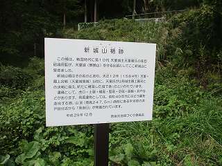| 北側から遠望する新城山館。ここからの比高は50mほどある。 | 東側の山麓に建てられている案内板。 |