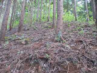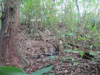 | そこから斜面を直登していった。急峻である。 | 最初の切岸と帯曲輪。 |