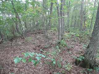 1かうから平坦な尾根を南西に進んで行くと途中に堀切があった。これを越えてさらに進んで行く。尾根上は自然地形のようである。