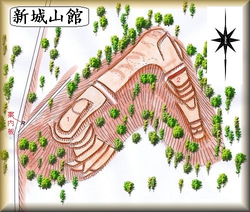 このように新城山館は、北側に向かって突き出した2つの山稜の先端に郭を配置し、その下に何段もの郭を配置するといった形状の山城であった。