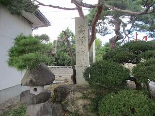 城の南端部に差し掛かると、道路沿いに城の案内板と城址碑とが建てられているのが目に入ってくる。