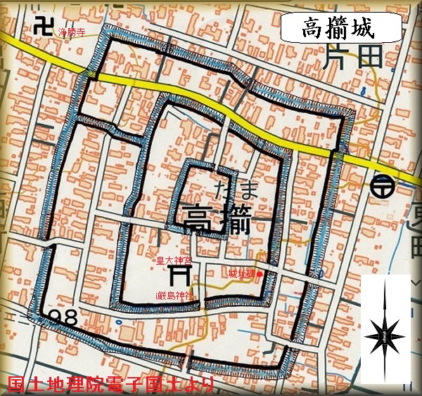 | 高擶城は、応永年間(1394〜1428)に高橋義直によって築かれたのが始まりとされる。高橋義直は、斯波最上氏2代直家の4男であった。最上氏とは同族である。 もっとも、最初に築かれた城館は、もっと西にある羽州街道沿いの「楯の城」という地点にあったと言われている。 その後 高擶城は天童氏に奪われ、天童城の支城となった。城が現在の位置に築かれたのは、この天童頼基によってである。 天正12年(1548)、最上義光の天童城攻撃によって天童氏が滅亡すると、高擶城は再び最上氏の所領となった。 慶長5年(1600)、関ヶ原合戦の後、宮内内蔵丞が4千石で高擶城に入城した。 元和年間には楯岡城主楯岡光直の家老斎藤伊予守が5千5百石で高擶城主となった。 元和8年(1622)、お家騒動によって最上氏が改易となると、高擶城も廃城となった。 後、旧二ノ丸に、舘林藩の飛び地4万石を管理するための陣屋が設置された。 |