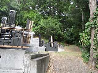 | 石行寺の背後にそびえる比高50mほどの山稜が城址である。 | この墓地のすぐ上が城域内。 |