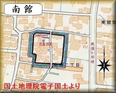 その名も南館という地名の所にある神明神社が南館の跡である。周囲は民家が建て込んでいるが、神社の南側に児童公園があり、ここに車を停めておくことができる。
