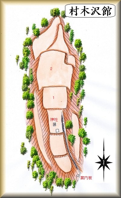 | 村木沢館は、最上48楯の1つであった。城主は神保隠岐守(4000石)であったと言われる。 慶長5年の関ケ原役の頃には、江口五兵衛光清(8000石)が村木沢城主になっていたとも伝えられ、その菩提寺長松寺跡が上長岡にあった。 慶長5年の戦役の際、山形から引き返した上杉軍は、この城で野営した。その際に傷ついた上杉家臣の溝口左馬之助が、ここで死去した。その時の首洗い池が、今も水を湛えているという。 |
