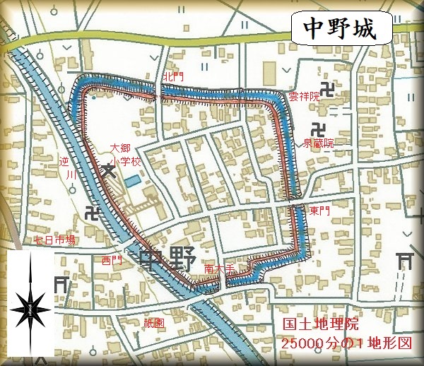 逆川に臨む大郷小学校の一帯が中野城の跡であったと言われる。小学校の中庭には城に関する案内板が立てられている。